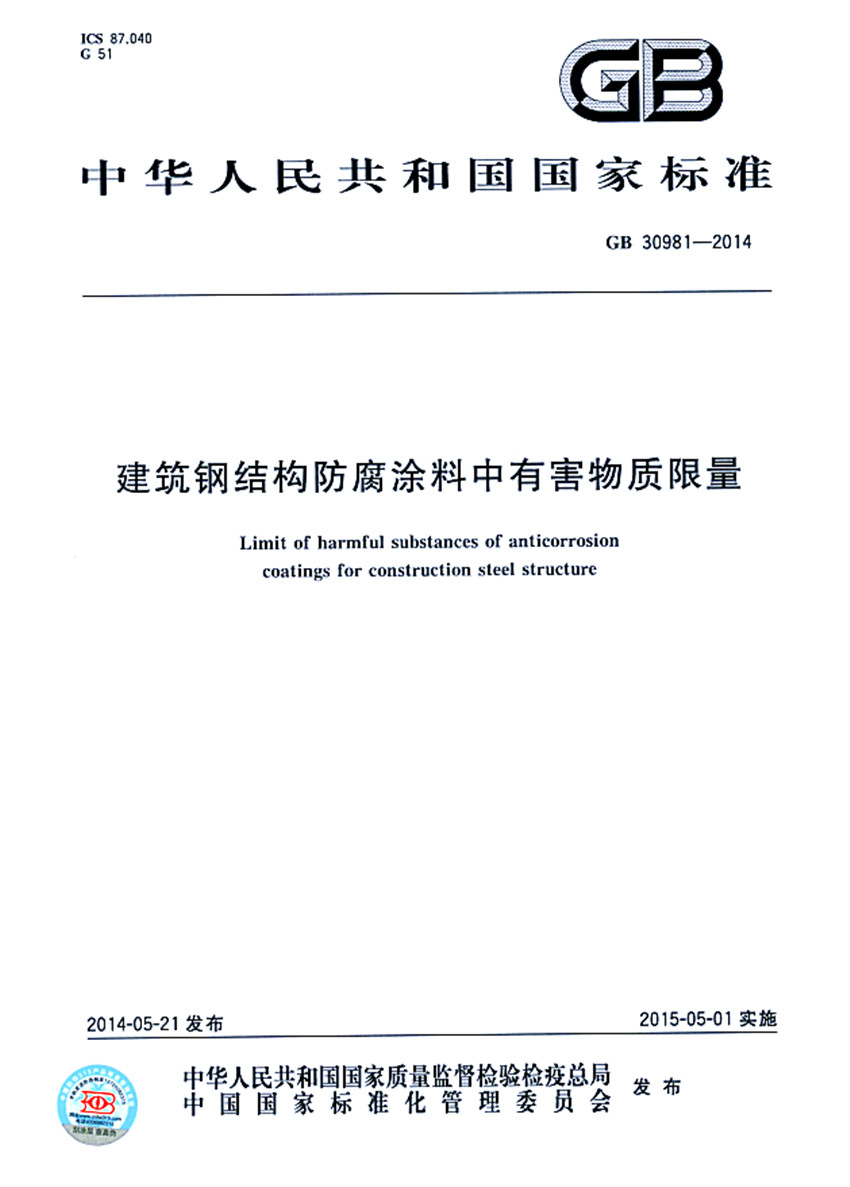 建筑鋼結(jié)構(gòu)防腐涂料中有害物質(zhì)限量標(biāo)準(zhǔn)GB 30981-2014 ICS87.040 G51 GB 中華人民共和國(guó)國(guó)家標(biāo)準(zhǔn) GB 30981-2014 建筑鋼結(jié)構(gòu)防腐涂料中有害物質(zhì)限量 Limit of harmful substances of anticorrosion coatings for construction steel structure 2014-05-21發(fā)布 2015-05