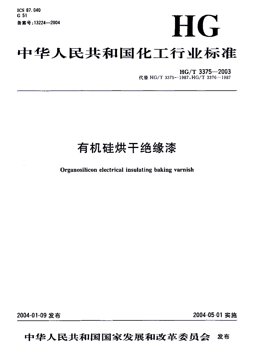 HG/T 3375-2003有機(jī)硅烘干絕緣漆標(biāo)準(zhǔn) ICS87.040 G51 備案號(hào):13224-2004 HG 中華人民共和國(guó)化工行業(yè)標(biāo)準(zhǔn) HG/T 3375-2003代替 HG/T 3375-1987,HG/T 3376-1987 有機(jī)硅烘干絕緣漆Organosilicon electrical insulating baking varnish 2004-01-09發(fā)布,2004-