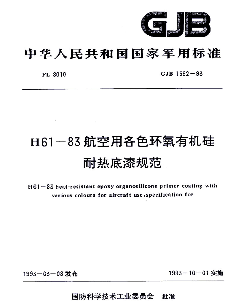 H61-83航空用各色環(huán)氧有機(jī)硅耐熱底漆規(guī)范標(biāo)準(zhǔn)GJB 1592-93 GJB 中華人民共和國(guó)國(guó)家軍用標(biāo)準(zhǔn) FL8010 GJB 1592-93 H61-83航空用各色環(huán)氧有機(jī)硅耐熱底漆規(guī)范 H61-83 Heat-resistant epoxy organosilicnne primer with coating with various colours for aircraft use,sp