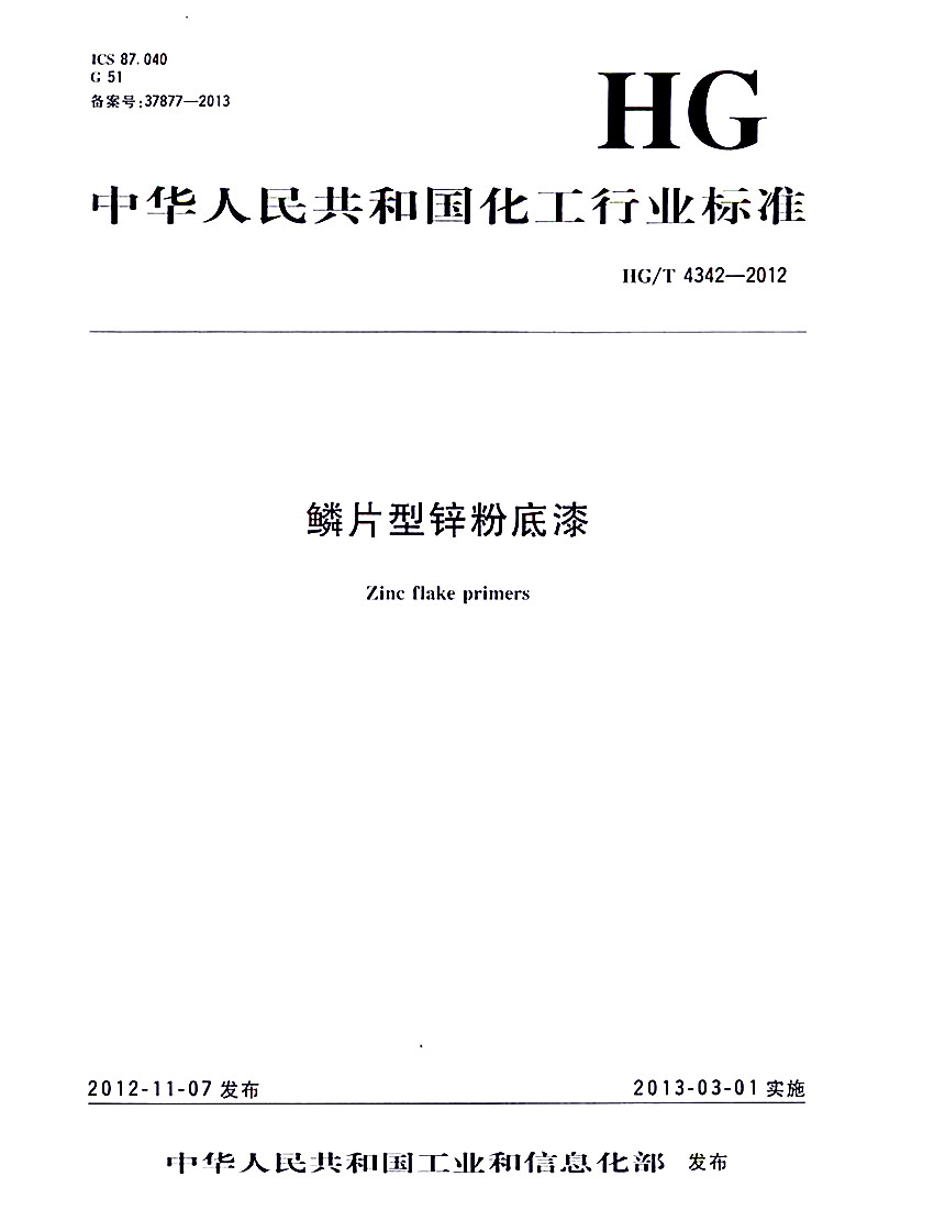 HG/T 4342-2012鱗片型鋅粉底漆標(biāo)準(zhǔn) ICS87.040 G51 備案號(hào):37877-2013 HG 中華人民共和國(guó)化工行業(yè)標(biāo)準(zhǔn) HG/T 4342-2012 鱗片型鋅粉底漆Zinc flake primers 2012-11-07發(fā)布 2013-03-01實(shí)施 中華人民共和國(guó)工業(yè)和信息化部 發(fā)布 本標(biāo)準(zhǔn)規(guī)定了鱗片型鋅粉底漆的產(chǎn)品分類、要求、試驗(yàn)方法、檢驗(yàn)規(guī)則、標(biāo)志、包裝和貯存等內(nèi)容。本