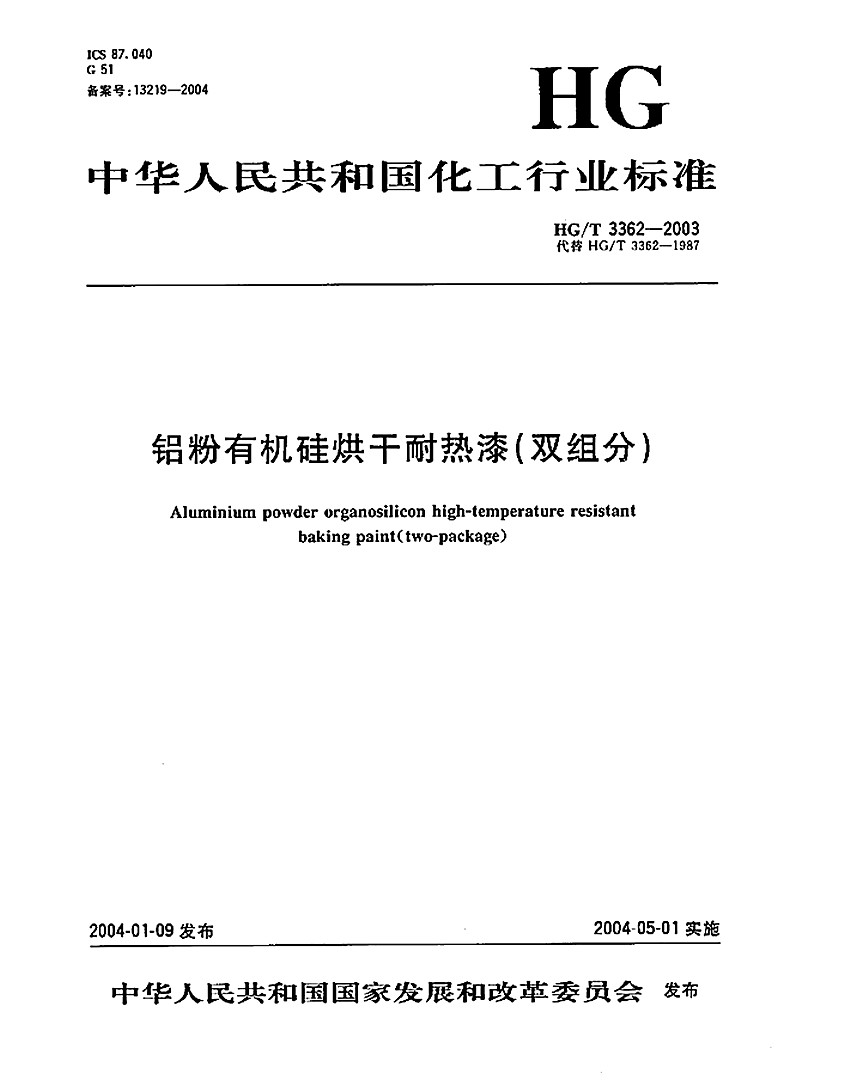 有機(jī)硅耐高溫漆標(biāo)準(zhǔn)HG/T3362-2003 ICS 87. 040 G 51 備案號(hào):13219-2004 HG 中華人民共和國(guó)化工行業(yè)標(biāo)準(zhǔn) HG/T 3362-2003代替 HG/T 3362-1987 鋁粉有機(jī)硅烘干耐熱漆(雙組分) Aluminium powder organosilicon high-temperature resistant baking paint(two-