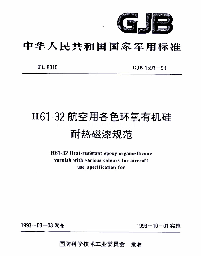 H61-32各色環(huán)氧有機(jī)硅耐熱磁漆標(biāo)準(zhǔn)GJB 1531- 93 GJB 中華人民共和國(guó)國(guó)家軍用標(biāo)準(zhǔn) FL8010  GJB 1531- 93 H61- 32航空用各色環(huán)氧有機(jī)硅耐熱磁漆規(guī)范 H61-32 Heat-resistant epoxy organosilicnne vrnish with various colonrs fnraircrufl use speciflc