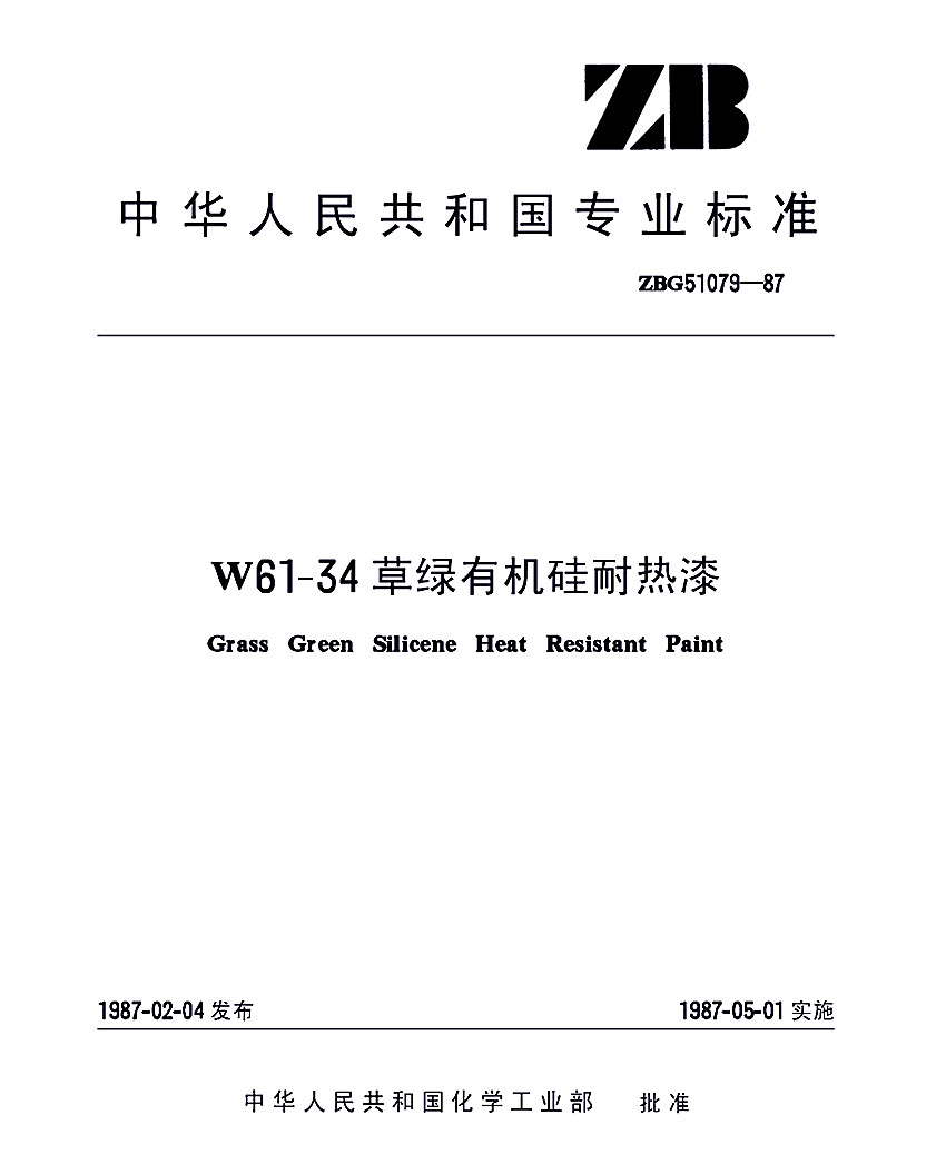 HG/T 3361-1987 W61-34草綠有機(jī)硅耐熱漆標(biāo)準(zhǔn)ZBG51079-87(代替HG 2-637-74) ZB 中華人民共和國(guó)專業(yè)標(biāo)準(zhǔn) ZBG51079-87 W61-34草綠有機(jī)硅耐熱漆Grass Green Silicene Heat Resistant Paint 1987-02-04發(fā)布,1987-05-01實(shí)施 中華人民共和國(guó)化學(xué)工業(yè)部 批準(zhǔn) ZBG51079-87代替HG 2