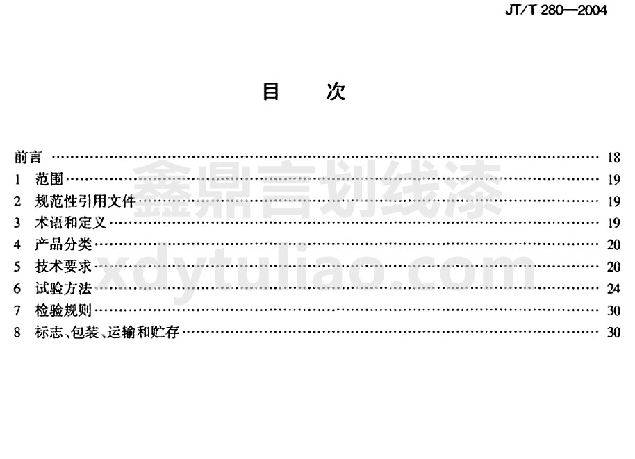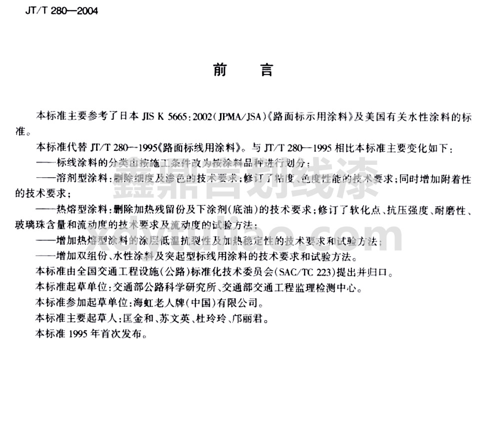 JT/T 280-2004路面標(biāo)線涂料標(biāo)準(zhǔn)是小編照搬JT/T 280-2004《路面標(biāo)線涂料》紙質(zhì)版內(nèi)容,大家可以放心參考。更多防腐涂料執(zhí)行國(guó)家和行業(yè)標(biāo)準(zhǔn)等防腐涂料相關(guān)信息可以參與網(wǎng)站:m.washingtonhomesite.com