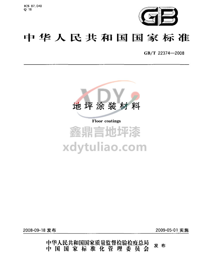 GB/T 22374-2008地坪涂裝材料國家標(biāo)準(zhǔn) 中華人民共和國國家標(biāo)準(zhǔn) GB/T 22374-2008 地坪涂裝材料Floor coatings 2008-09-18發(fā)行 2009-05-01實(shí)施 中華人民共和國國家質(zhì)量監(jiān)督檢驗(yàn)檢疫總局 中國國家標(biāo)準(zhǔn)化管理委員會(huì) 發(fā)布 本標(biāo)準(zhǔn)規(guī)定了合成樹脂基地坪涂裝材料的術(shù)語和定義、產(chǎn)品分類、有害物質(zhì)限量及物理性能要求、試驗(yàn)方法、檢驗(yàn)規(guī)則、標(biāo)志、包裝、運(yùn)輸與貯