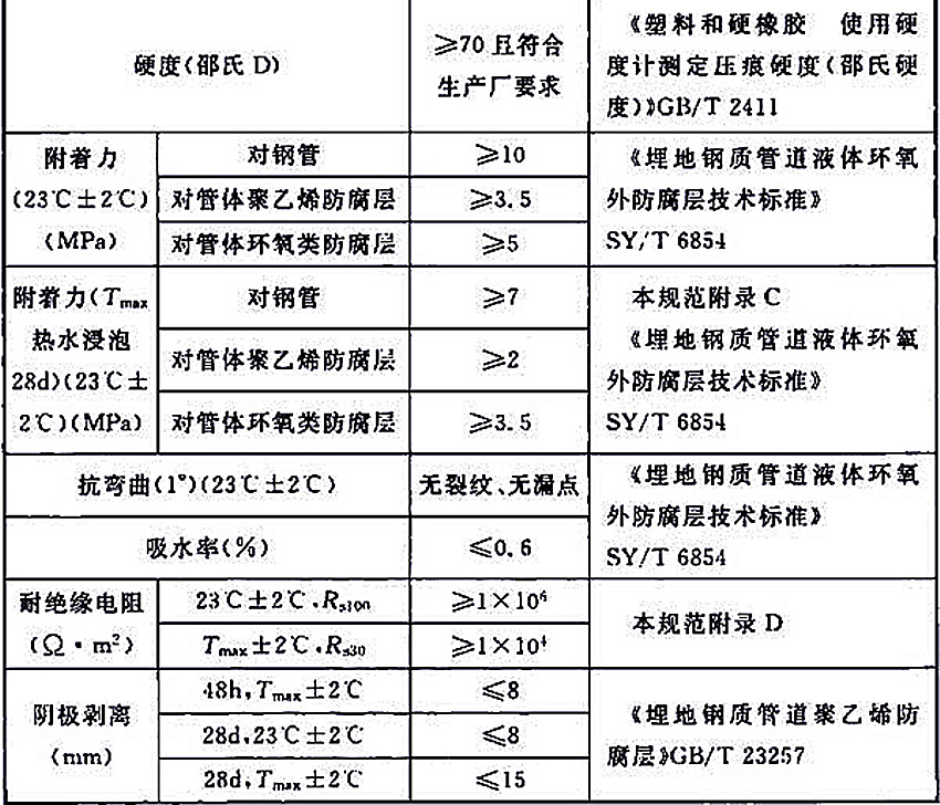 4.3 補(bǔ)口防腐層質(zhì)量檢驗(yàn)應(yīng)包括外觀、厚度、硬度、漏點(diǎn)和附著力,并應(yīng)符合下列規(guī)定: