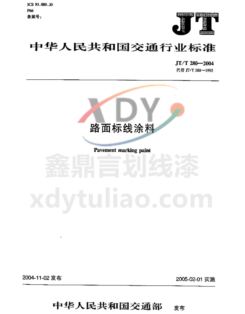 JT/T 280-2004路面標線涂料標準是防腐涂料小編照搬JT/T 280-2004《路面標線涂料》紙質版內容,大家可以放心參考。更多防腐涂料執(zhí)行國家和行業(yè)標準等防腐涂料相關信息可以參考官網(wǎng):m.washingtonhomesite.com ICS 93.080.30 P66 JT 中華人民共和國交通運輸行業(yè)標準 JT/T 280-2004路面標線涂料Pavement